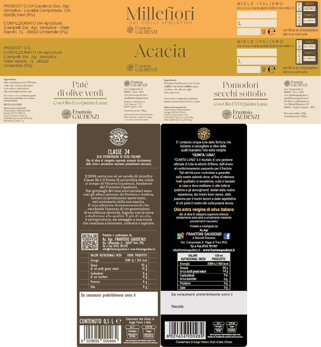All’interno del cofanetto trovi una selezione di oli extravergine di oliva della nuova raccolta 2025, accompagnati da mieli artigianali e stuzzicherie salate: