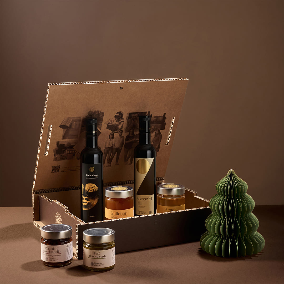 Un cofanetto natalizio con olio extravergine di oliva e prodotti tipici perfetto per chi ama i sapori autentici dei prodotti di alta qualità: gli oli EVO sono ideali per bruschette, verdure, carni bianche e piatti di pesce, mentre mieli e stuzzicherie completano l’esperienza dalla colazione all’aperitivo.